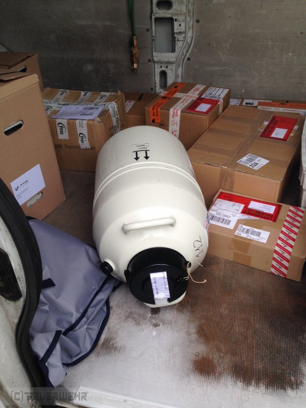 Der gemeldete Fahrzeugbrand entpuppte sich als umgekippter Druckbehälter. Das Kühlmittel trat aus und verursachte die starke Rauchentwicklung.