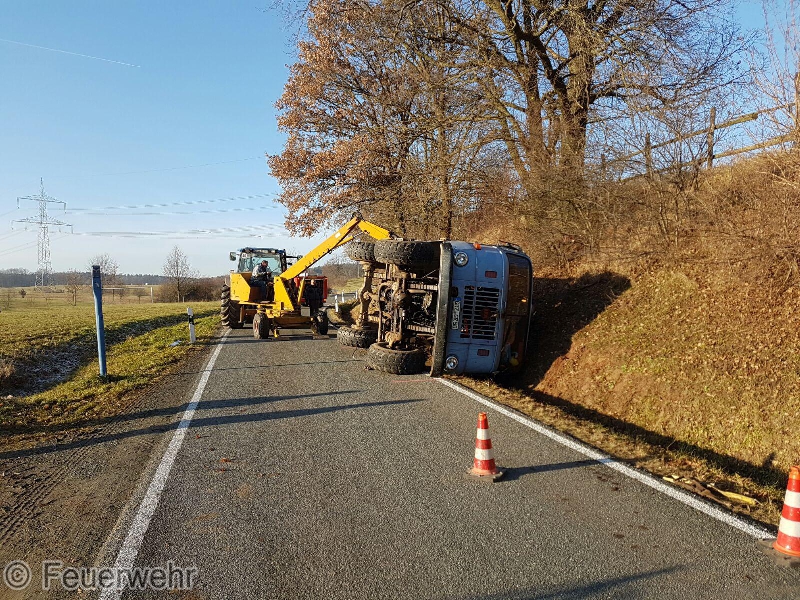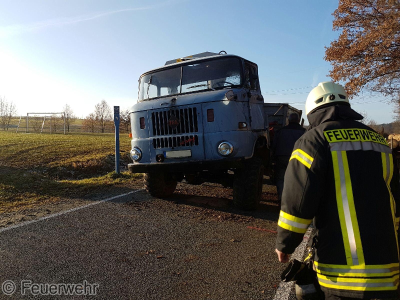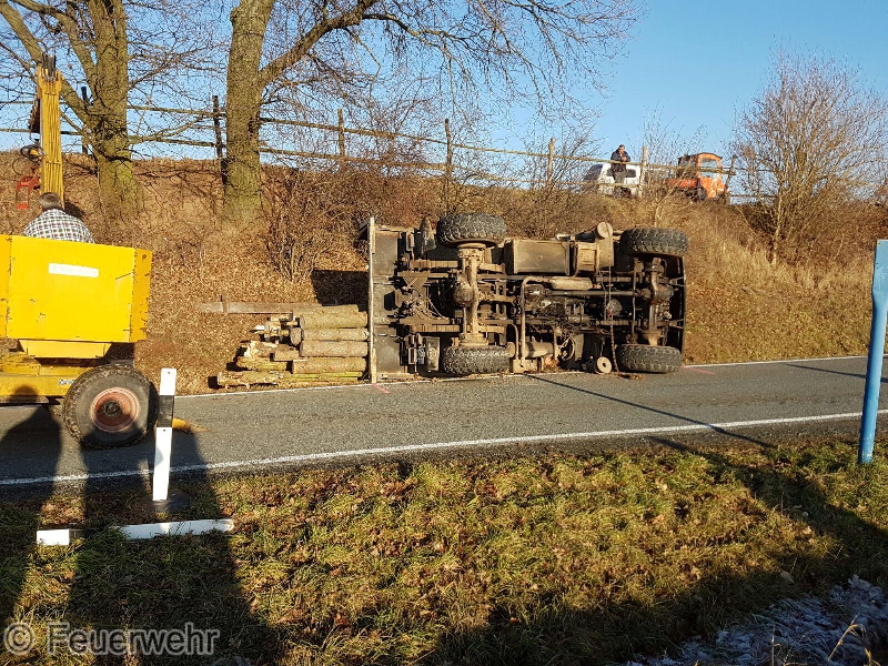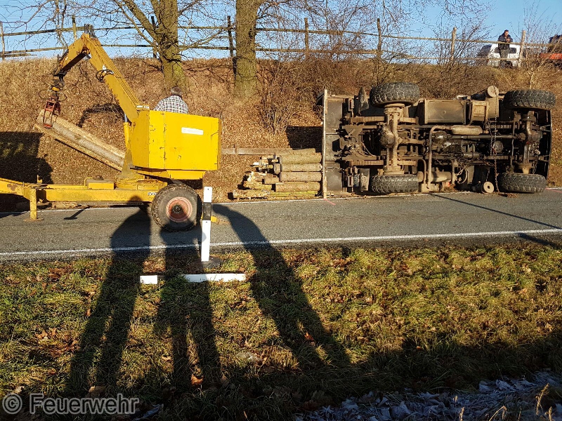 Ein mit Holz beladener LKW kam von der Straße ab und kippte um. Die Einsatzstelle wurde gesichert, der Fahrer wurde versorgt und auslaufende Flüssigkeiten wurden gebunden.