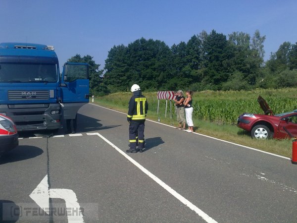 Durch Nichtbeachtung der Vorfahrt kollidierte ein abbiegender PKW mit einem LKW. Der PKW landete total zerstört im Straßengraben. Die beiden Insassen wurden dem Rettungsdienst übergeben.